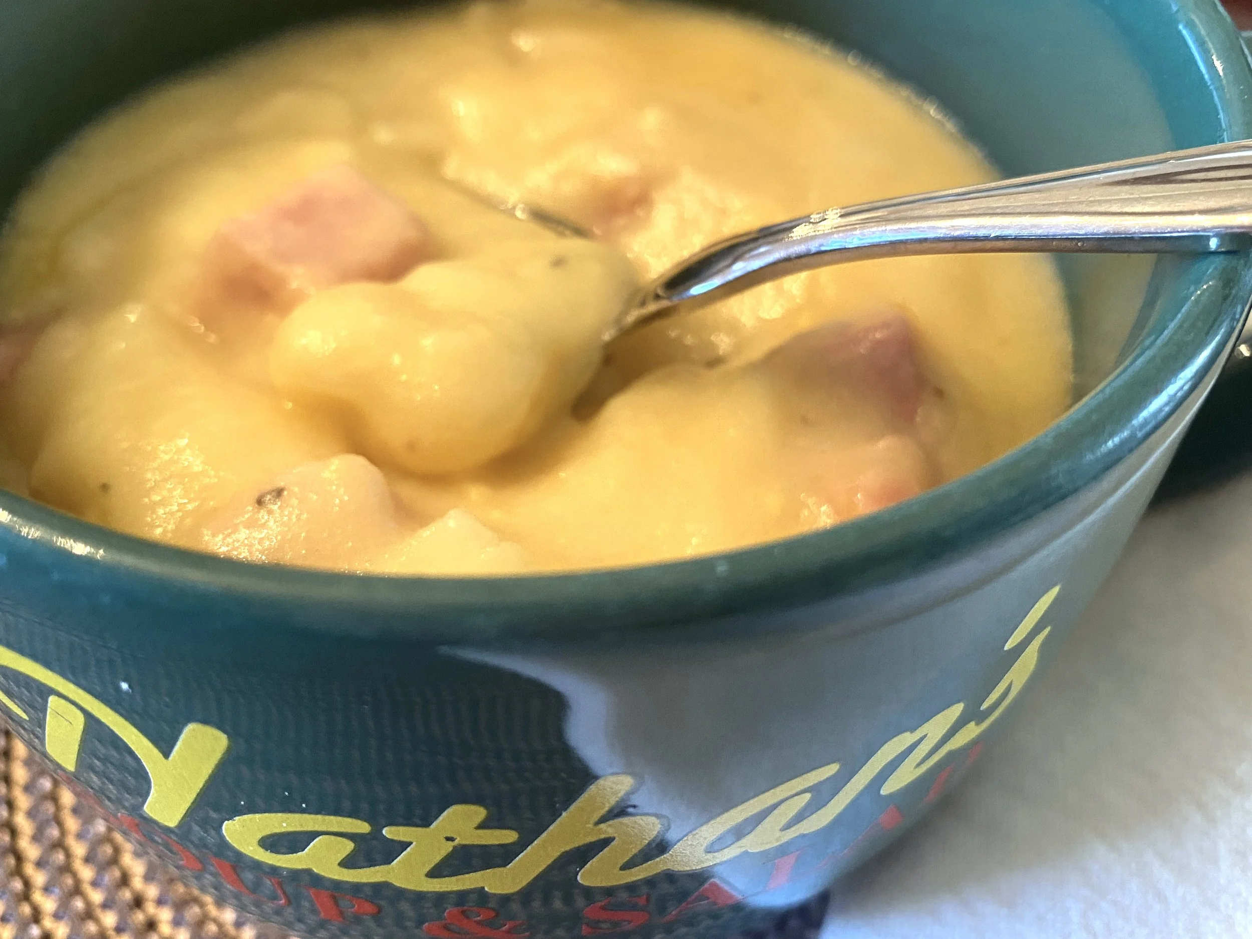 This hearty chowder is made with smoked ham and aged cheddar cheese, slow-cooked with tender potatoes, and light cream. This is how you describe Comfort Food!